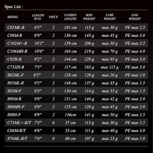 8.6フィート(約2.6m):取り回しが良く、港湾部での釣りに適している。飛距離はやや劣る。