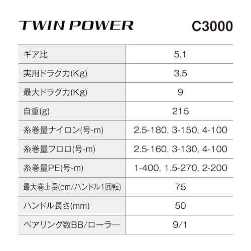 | C3000 | 5.1 | 215 | 9 | 1-400, 1.5-270, 2-200 | バス釣り・エギング・シーバス |