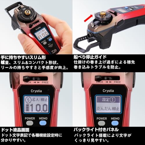 知人のベテランアングラーに勧められて購入しましたが、大型ドット液晶の見やすさと、縦型スプールの直感的な操作性に驚かされました。特に印象的だったのは転倒防止レッグで、高速巻き上げ時でもリールが浮き上がることなく安定した釣りができます。スピードシフト機能により、通常の巻き上げ速度と別設定の速度を瞬時に切り替えられるのも便利な機能です。