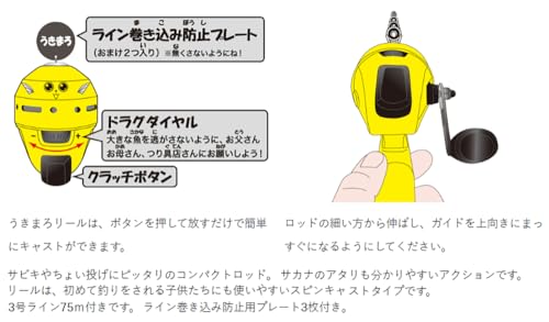 がまかつのかわいらしいキャラクター「うきまろ」でデザインされており、見た目の可愛さだけでなく機能も充実しています。3段階シフトレバーやラインコントロールフレームなど、便利な機能が詰め込まれているのが印象的です。
